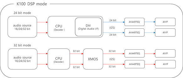 元のオーディオソース(音源)を忠実に再現するため、内部処理においてデータ損失は極力避けなければなりません。K100は最新のコンポーネント性能に依存するだけではなく、DSPモードを実装したXMOSとの独自のソリューションで他に類を見ない完璧な32ビットデータデリバリー処理を実現し、高性能DACへの徹底的な最適化で音源本来のサウンドを完璧に引き出します。これは光出力を含めたあらゆる出力にも影響をもたらします。そして高性能バッテリーの恩恵をフルに活かした高出力アンプ(バランス 8.0 Vrms、アンバランス 4.0 Vrms)とのトータルバランスは、普段聞きなれた音楽ですら全く新しい音楽体験にアップグレードします。